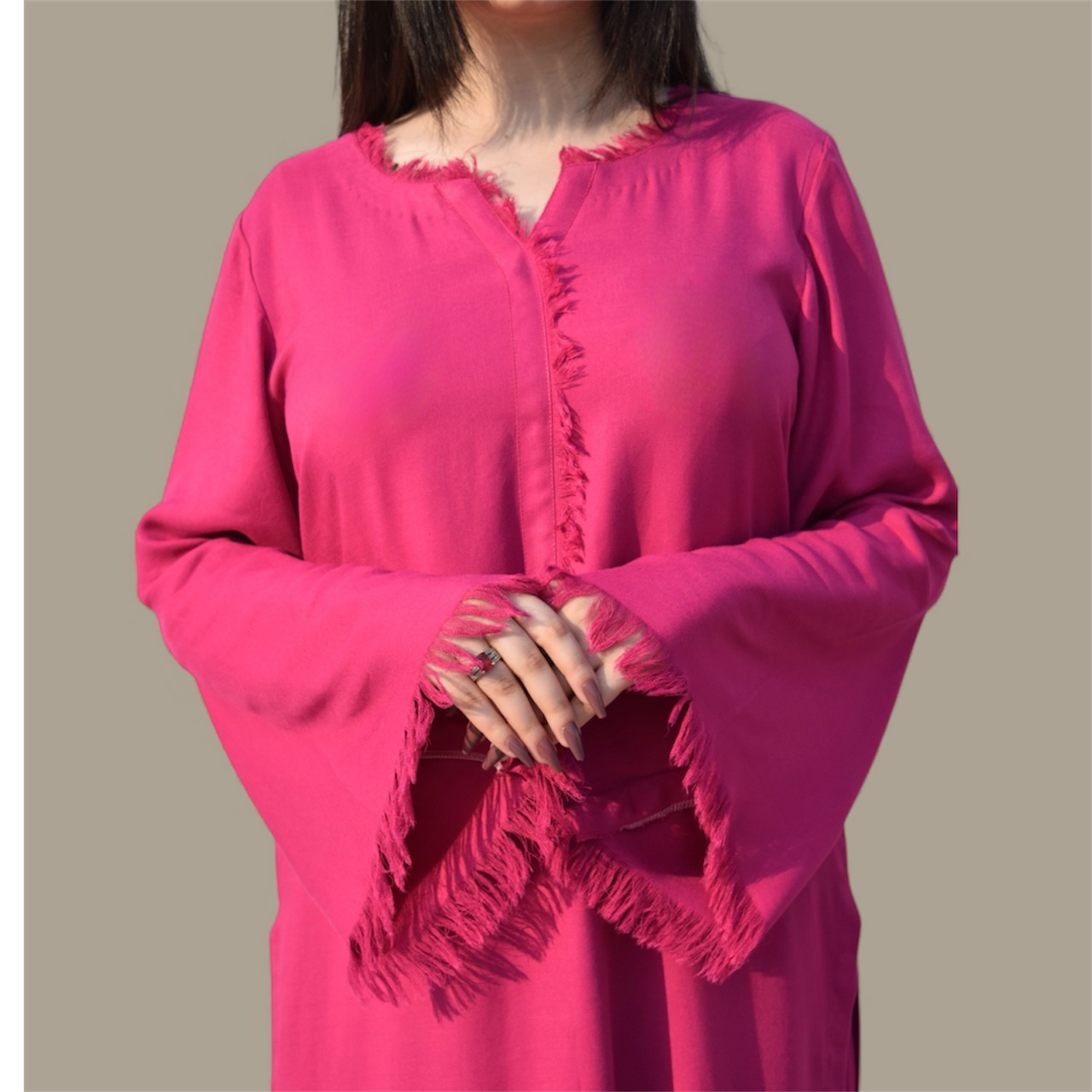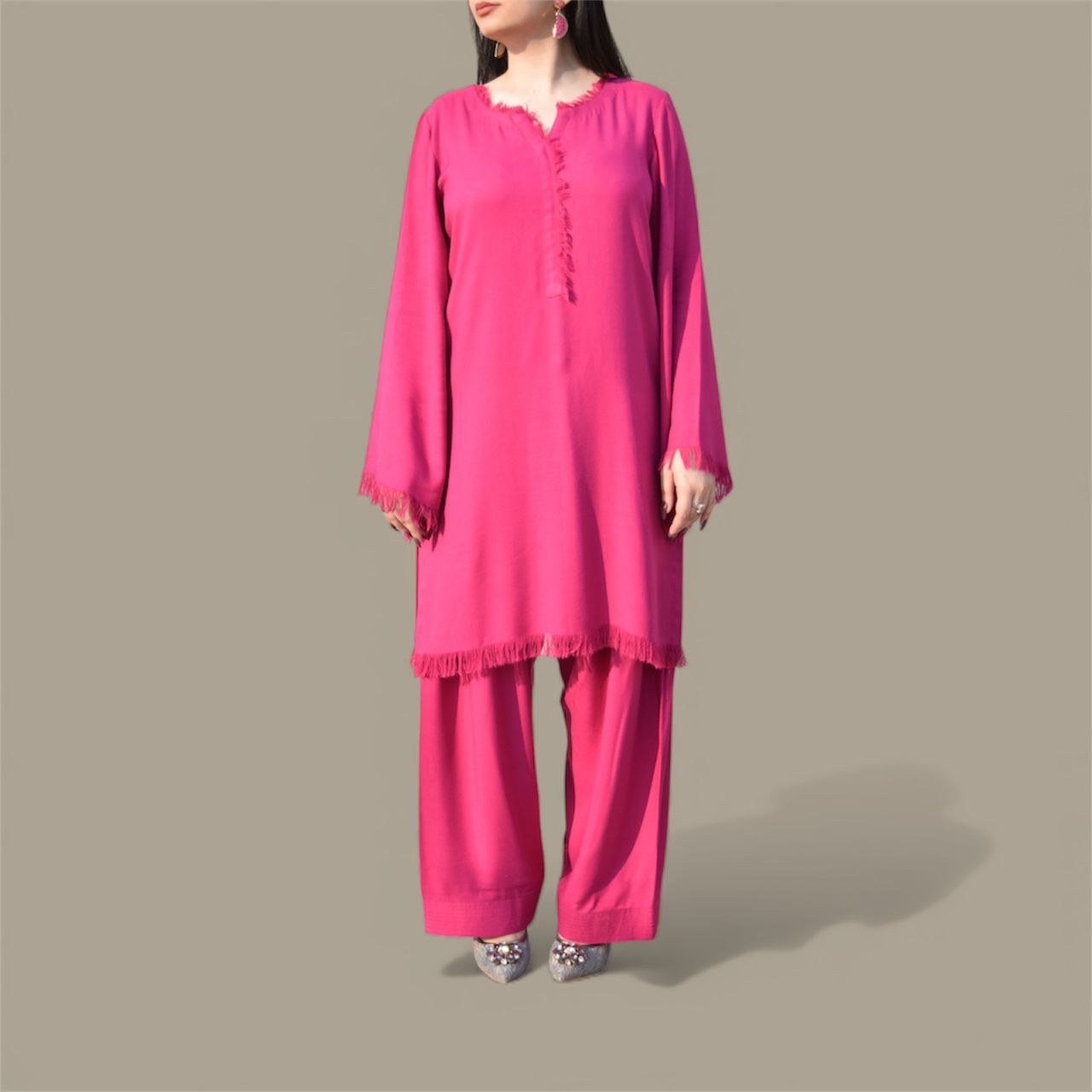 Design: Straight plain kurta featuring signature fringed sleeves, Paired with a traditional shalwar that adds graceful volume and a touch of classic elegance.
