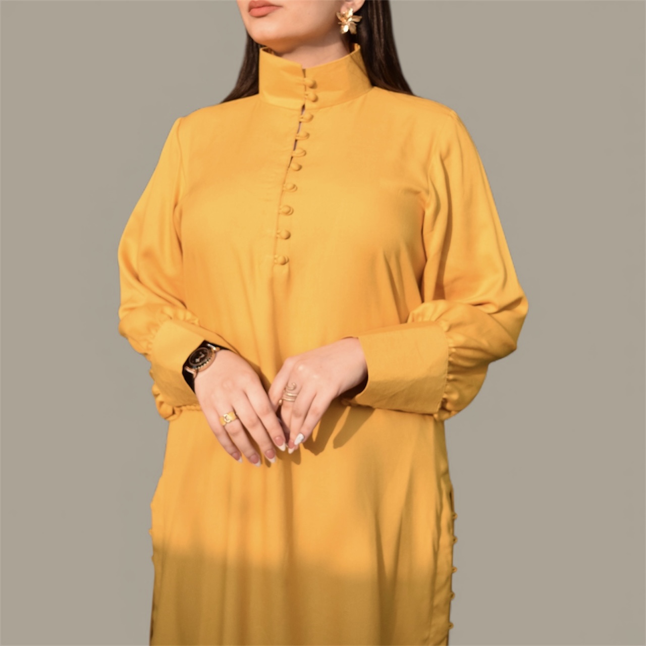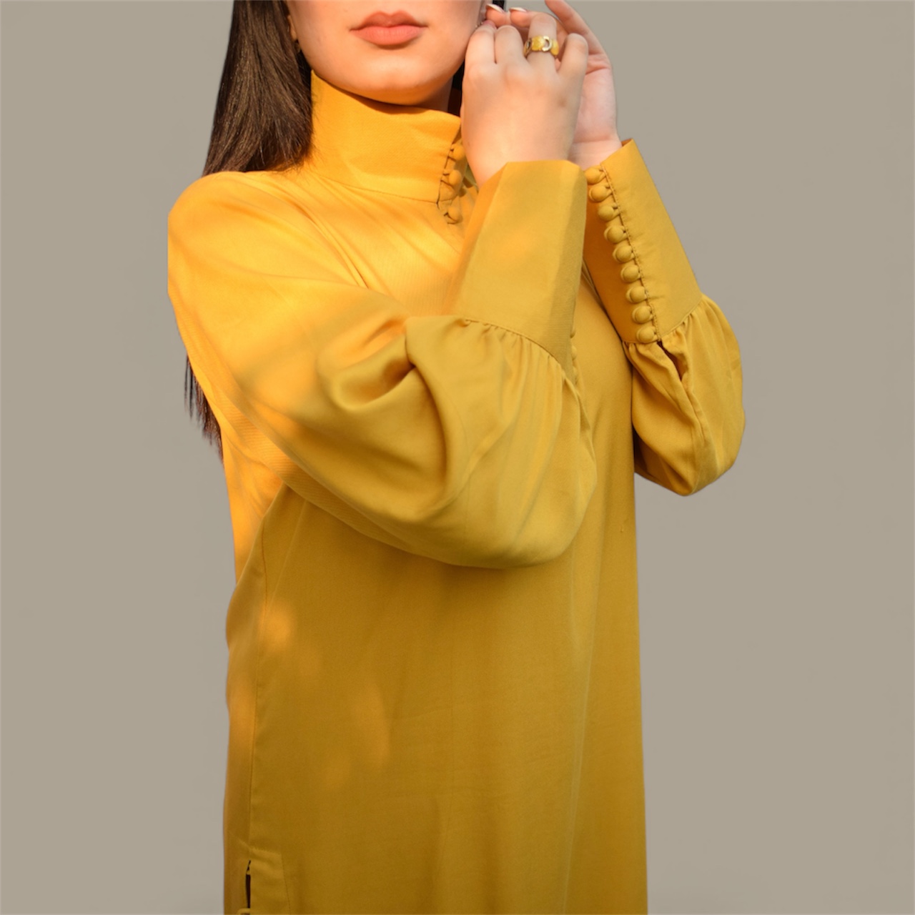 Design: Straight shirt with side loops, Puff sleeves with buttoned high neck