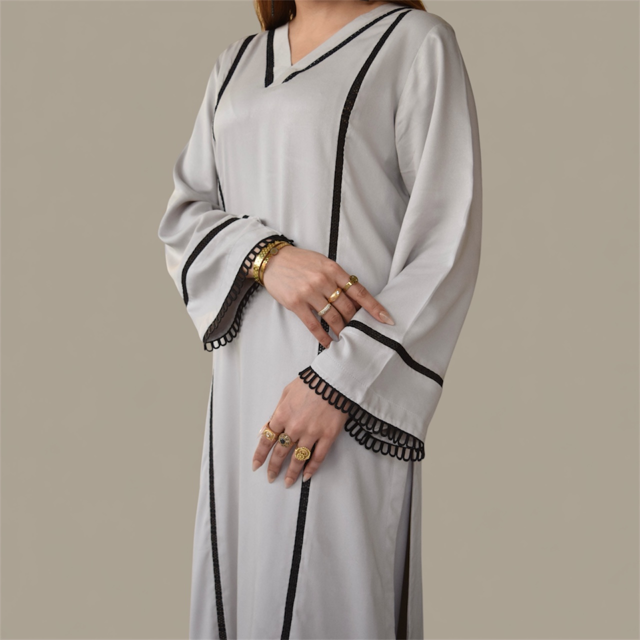 Design: Contrast black piping on neckline, sleeves, and borders.