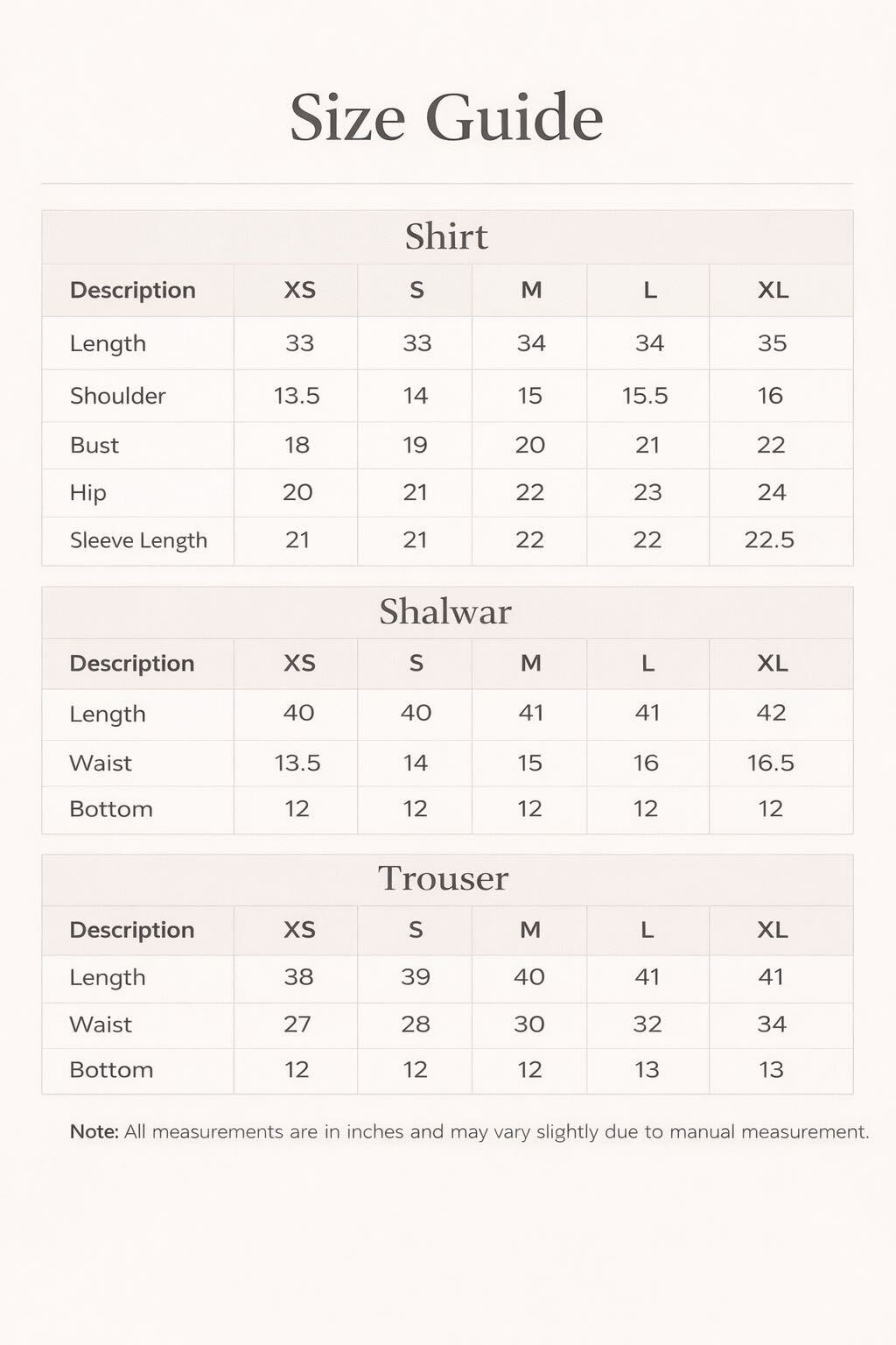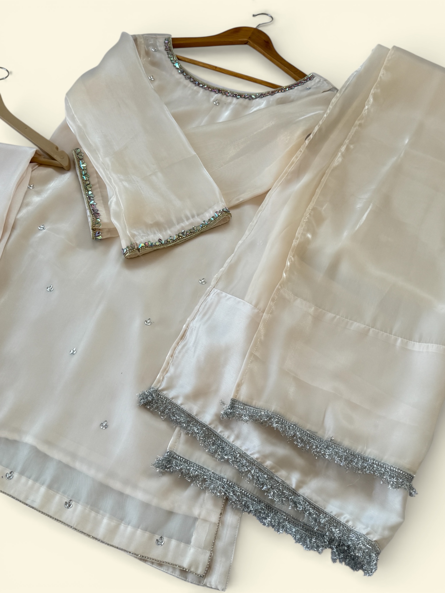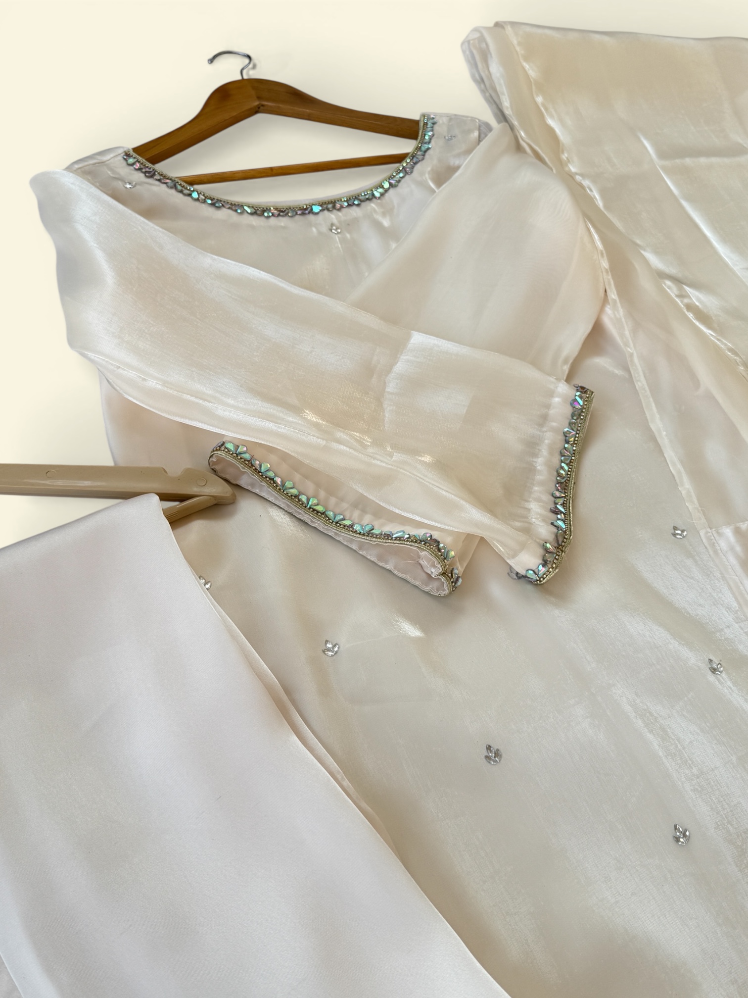 The 3-piece outfit crafted from premium Korean Sheesha Silk in a graceful pearl white shade. The medium-length shirt features delicate embellishments and a beautifully detailed neckline with matching sleeve borders. Paired with stylish bell bottom trousers and a Korean silk dupatta finished with a subtle decorative border. Shirt and trousers include Shamoz Silk lining for a smooth and comfortable feel. Perfect for festive and special occasions.
